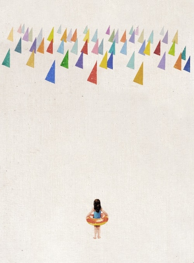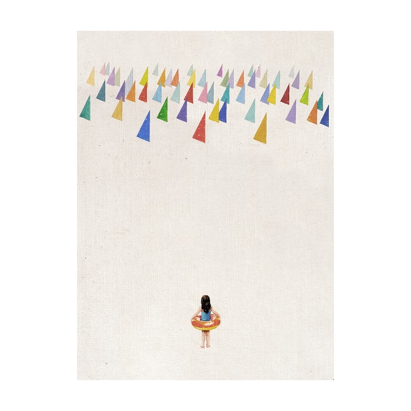 Una niña con un flotador de colores contempla triángulos multicolores que flotan en el aire sobre un fondo beige. Minimalismo, contraste y toques onÃricos que despiertan imaginación y curiosidad. Una obra que combina evasión, profundidad visual y elegancia.